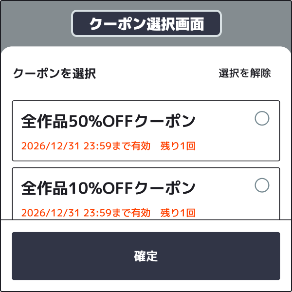 利用するクーポンを選択し、「確定」ボタンを押すことでクーポンを適用できます。