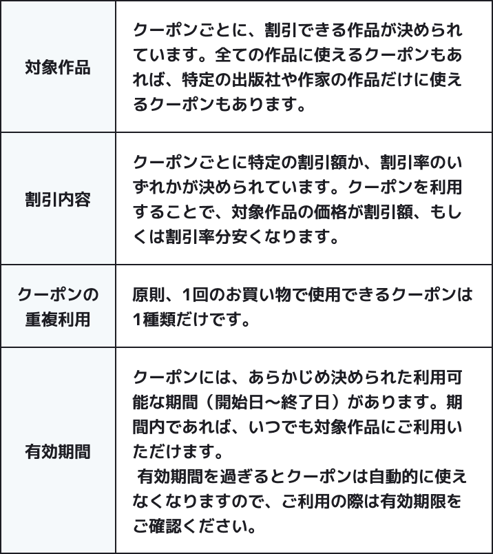 対象作品や割引内容、有効期間などの情報が、それぞれのクーポンごとに決められています。 詳しくはマイページ内の【クーポン一覧・コード入力】から確認ができます。